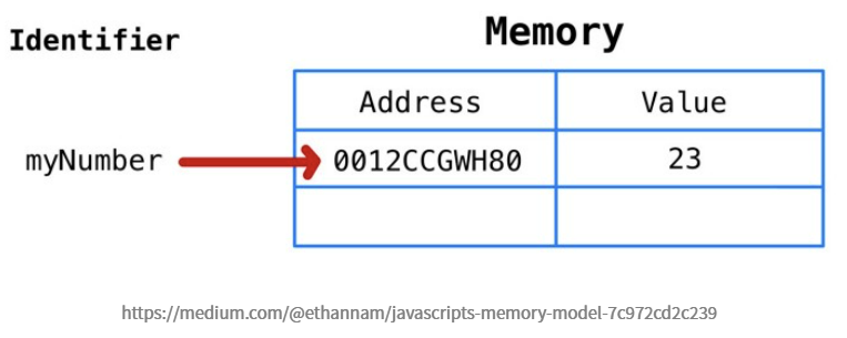변수명(식별자)인 myNumber는 변수의 값이 아닌 메모리 주소를 기억하고 있습니다. 변수명을 사용하면, 자바스크립트 엔진이 변수명과 매핑된 메모리 주소를 통해 거기에 저장된 값(23)을 반환합니다.